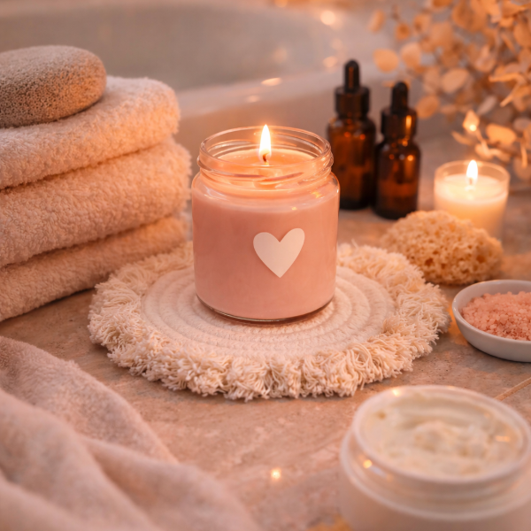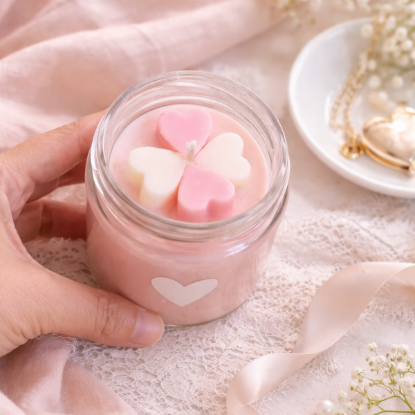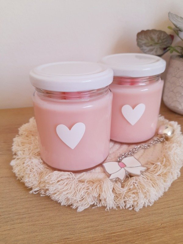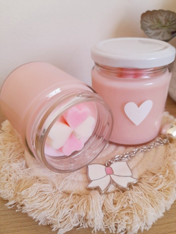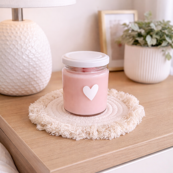 Vela de soja 200 ml en frasco de vidrio con tapa metálica blanca, decorada con vinilo de corazón blanco. En su interior esta decorada con 4 bombones de soja en forma de corazón.